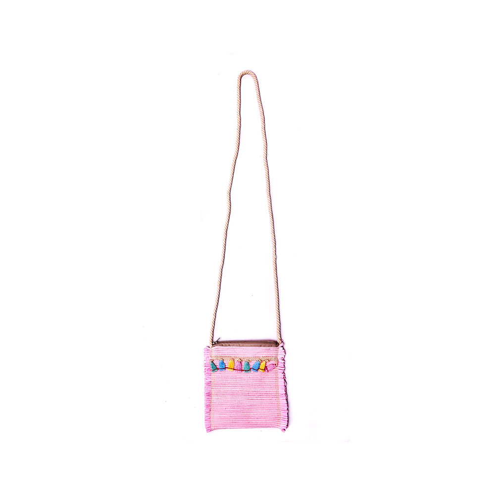 Πρακτικό τσαντάκι χιαστί από κουρελού σε χρώμα ροζ. Εσωτερική επένδυση με βαμβακερό υφασμα. Κλείνει με φερμουαρ για να ασφαλίσετε κλειδιά, κινητό και πορτοφόλι. Χειροποίητο από Αργαστήρι Καλύμνου σε παραδοσιακό αργαλειό.
